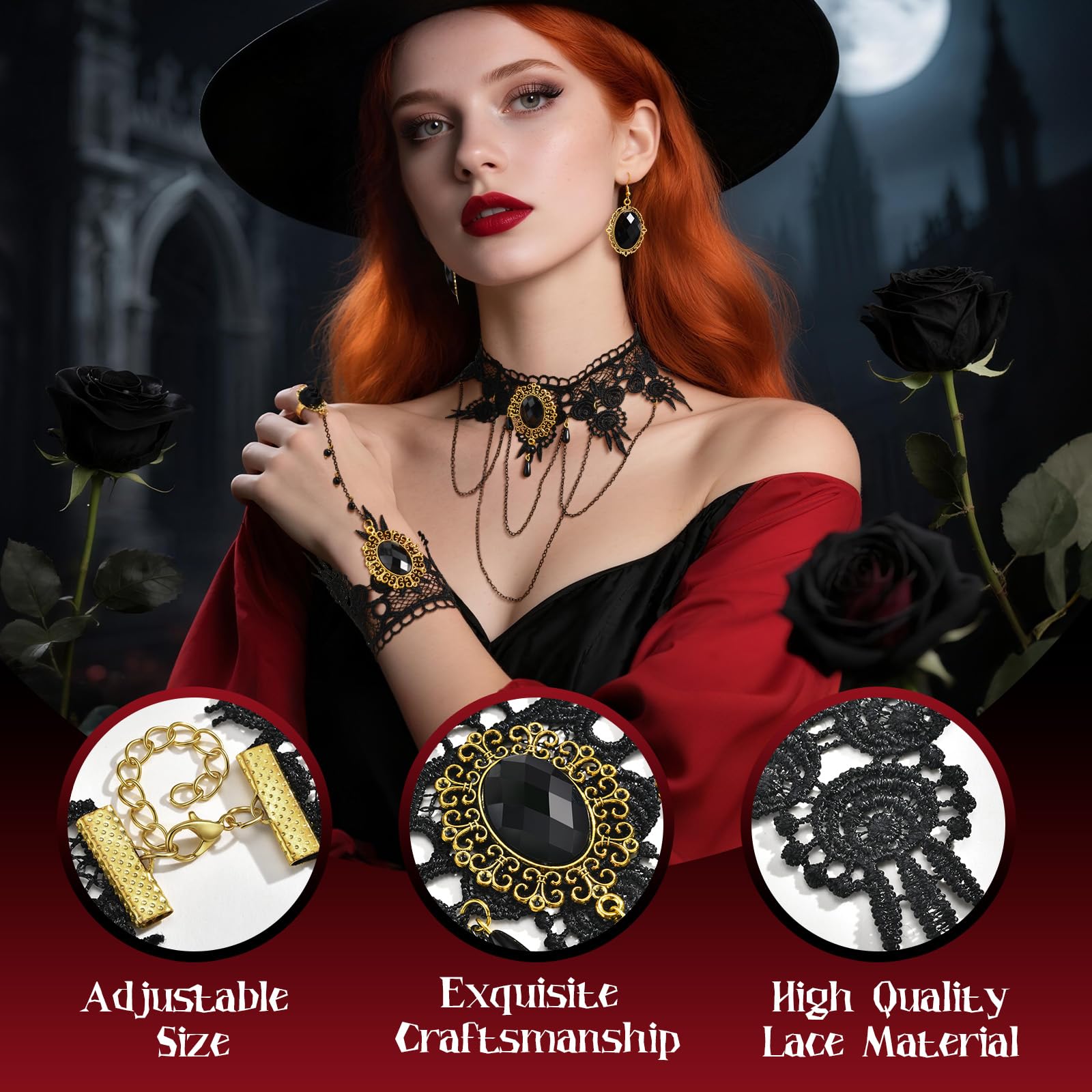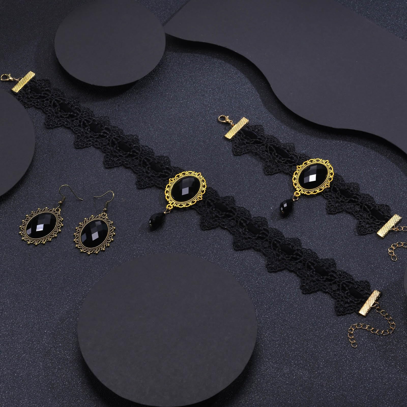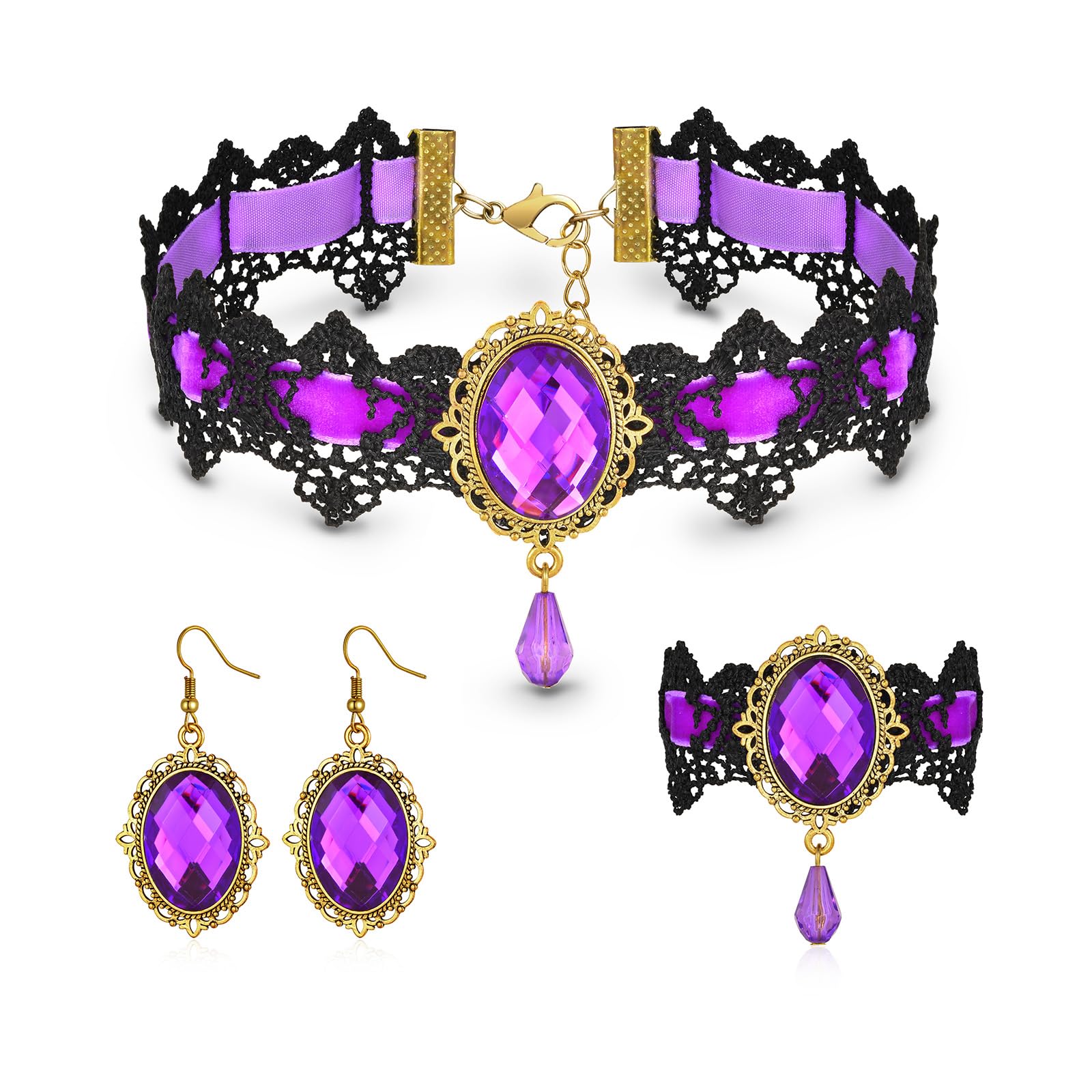 - 🖤 Halloween Gothic Jewelry Set: This exquisite Gothic-style jewelry set includes a detailed choker necklace, a matching bracelet, and a pair of earrings. Designed to captivate, the set is available in deep blue, mystic purple, and classic Gothic black, making it perfect for Halloween, cosplay, or alternative daily wear.Halloween costume accessories are perfect for Costume play, Masquerade, Witch, Vampire, Victorian, Steampunk, Lolita, Renaissance and Cosplay Costume accessories.